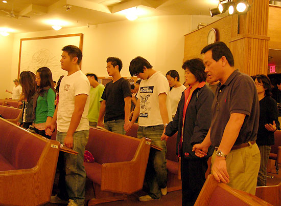 ▲부모와 자녀들이 함께 손을 잡고 기도하는 시간