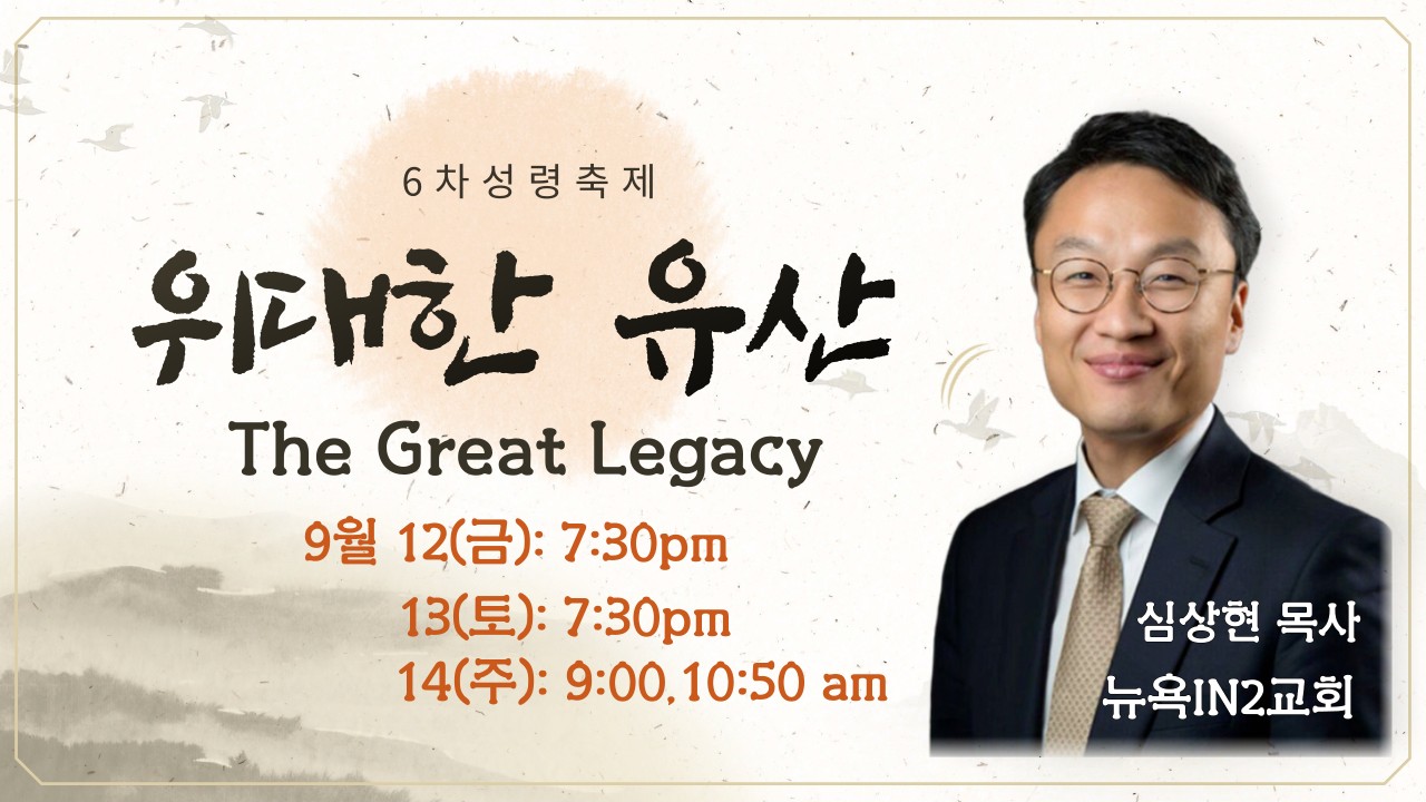 시애틀 비전교회(담임목사 고창훈)는 오는 9월 12일(금)부터 14일(주일)까지 '위대한 유산, 예수 그리스도(The Great Legacy)'라는 주제로 제6차 성령축제를 개최한다.