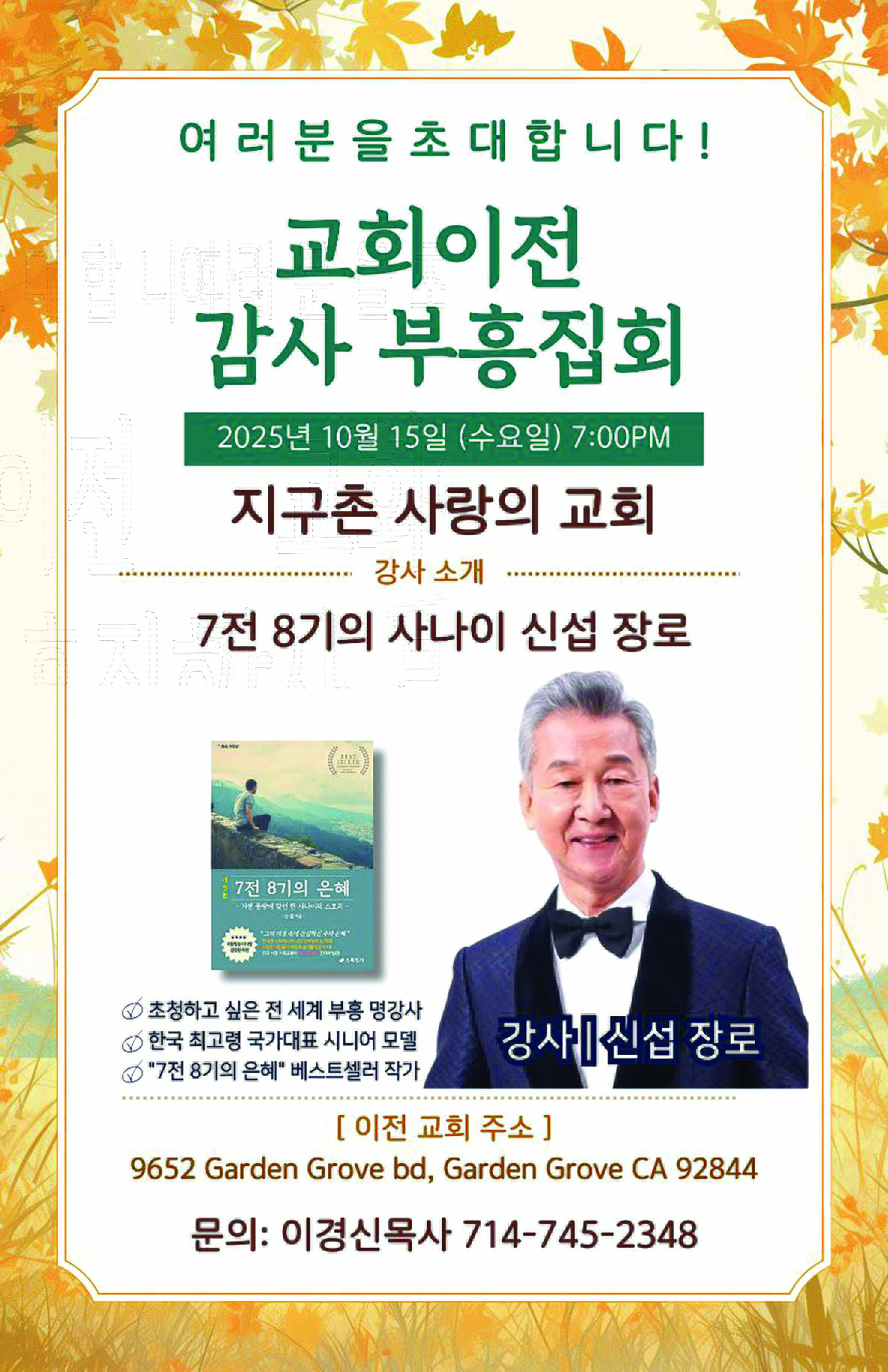 10월 15일(수) 오후 7시 지구촌 사랑의교회(이경신 목사)가 교회 이전 감사 부흥집회를 연다.