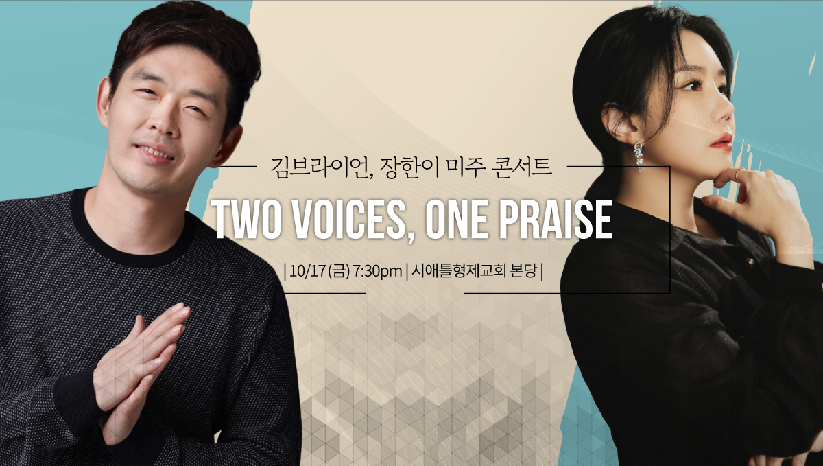 CCM 사역자 김브라이언과 장한이가 함께하는 찬양 콘서트 "Two Voices, One Praise"가 오는 10월 17일(금) 오후 7시 30분, 시애틀 형제교회(담임 권준 목사)가 바셀캠퍼스에서 열린다.