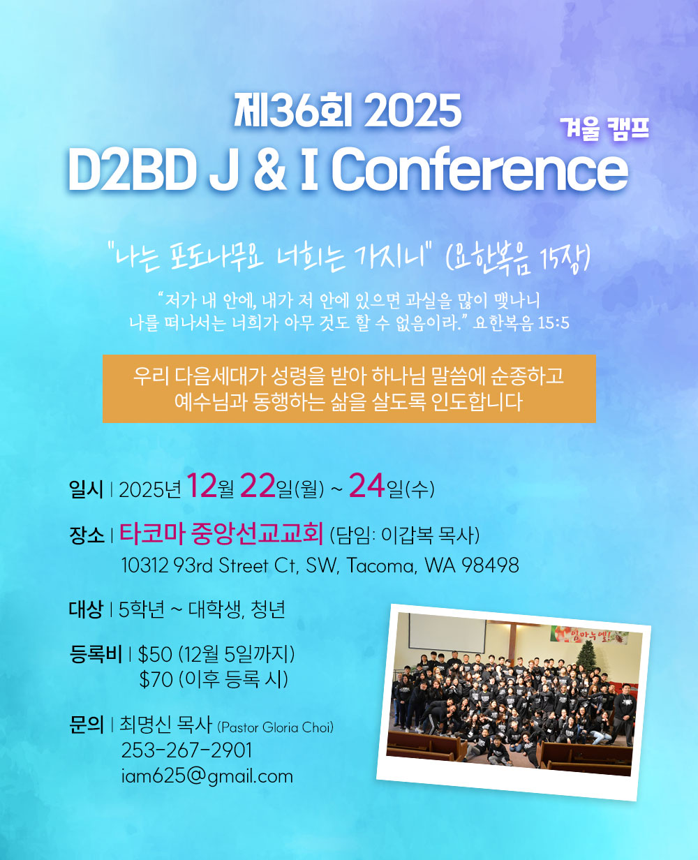 서북미 한인 차세대를 세우는 D2BD(Dare to be a Daniel) "J & I Conference"가 오는 12월 22일(월)부터 24일(수)까지 타코마 중앙선교교회 (담임 이갑복 목사)에서 개최된다.