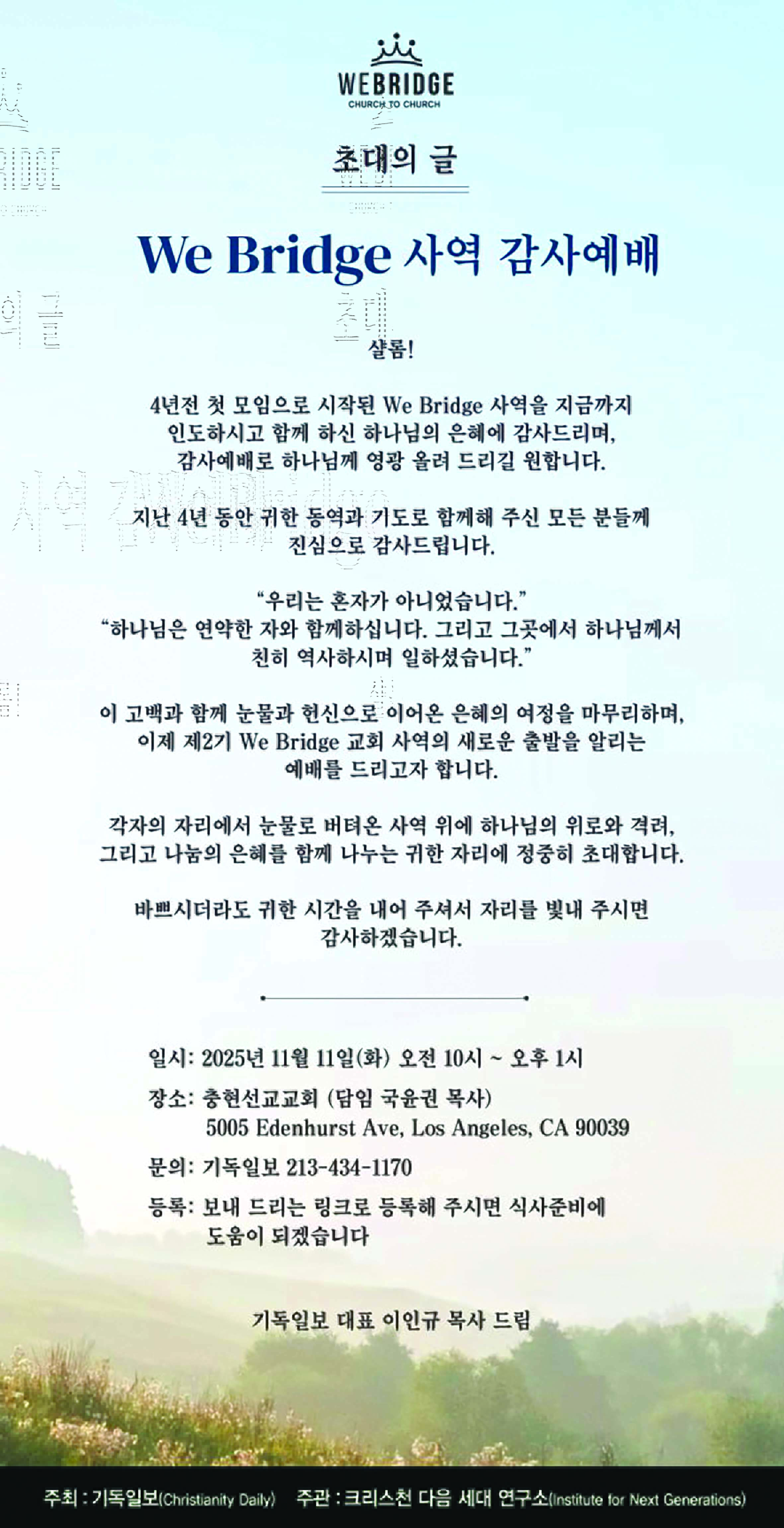 위 브릿지 사역은 팬데믹 기간 재정적 어려움으로 문을 닫는 한인교회들이 늘어나는 현실을 접하며 시작되었습니다. 기독일보는 남가주 지역 미자립교회들을 위해, 후원 가능한 교회와 재정 지원이 필요한 교회를 매칭하여 매월 500달러씩 3년간 지속적으로 후원하는 사역을 전개해 왔습니다.