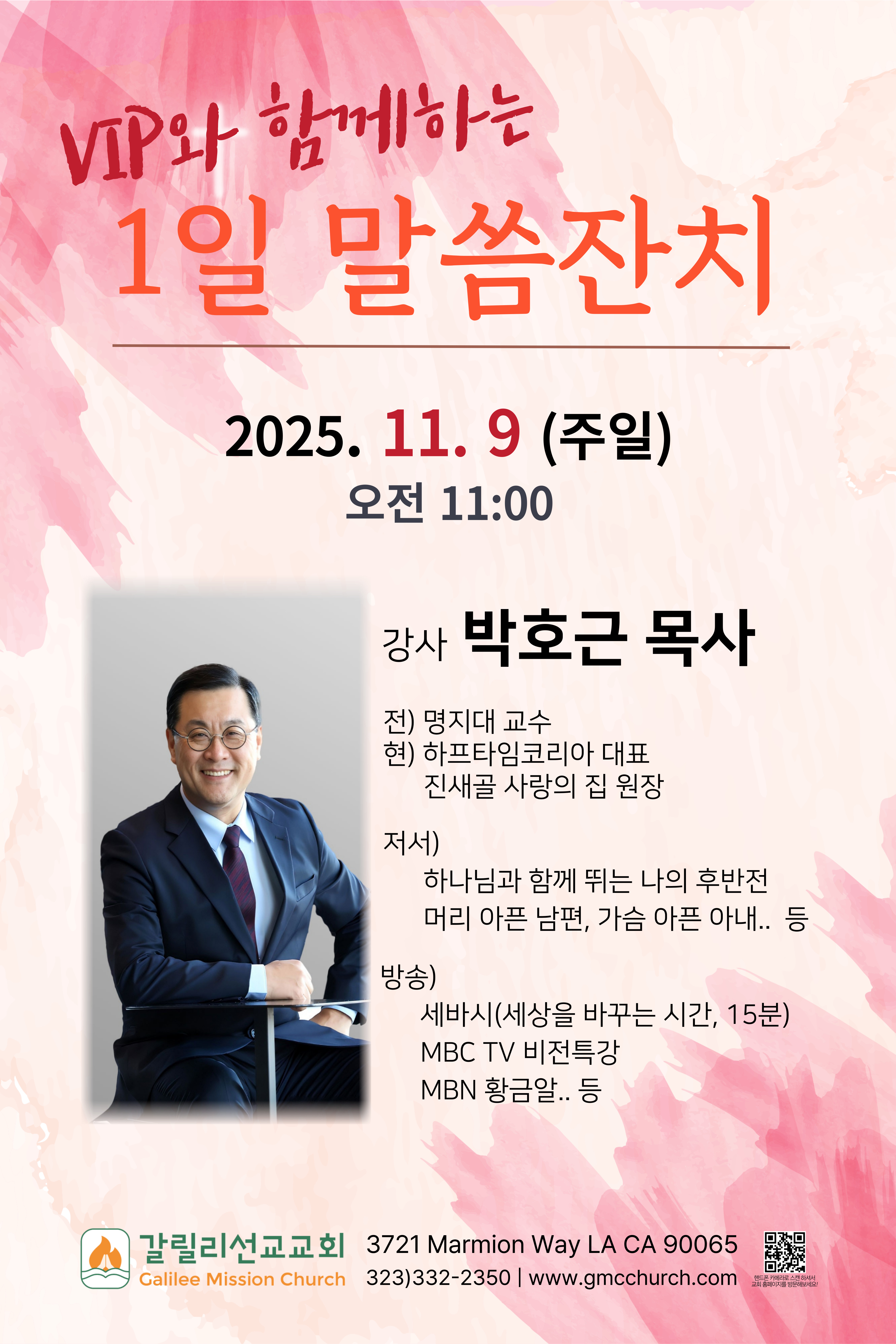 LA에 소재한 갈릴리선교교회(담임 한천영 목사)에서 “VIP와 함께 하는 1일 열린 말씀잔치”를 연다. 이번 말씀잔치는 ‘하프타임 코리아’ 대표 박호근 목사가 말씀을 전한다.