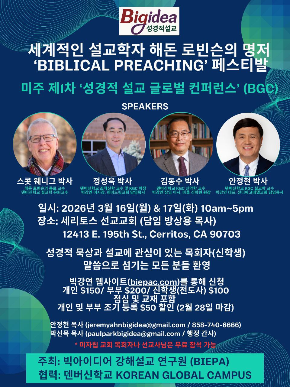 스피커로는 스콧 웨니그 박사(해돈 로빈슨 박사 동료교수, 덴버신학교 설교학 은퇴교수), 정성욱 박사(덴버신학교 조직신학 교수 및 KGC 학장, 빅강연 이사장, 덴버드림교회 담임), 김동수 박사(덴버신학교 KGC 신약학 교수, 빅강연 상임이사, 바울신학원 원장), 안정현 박사(덴버신학교 KGC 설교학 교수, 빅강연 대표, 샌디에고베델교회 담임)이 주 강사로 나선다.