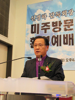신경하 감독회장 미주방문 환영예배가 1월 16일 나성한인감리교회에서 있었다. 이 자리에는 2백여명의 목회자와 축하객들이 참석해 신경하 감독회장의 미주방문을 환영했다.