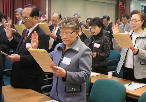 김창성 준비총장, 정혜숙 행정국장, 이백용 기획팀장의 유치경위 및 준비상황 설명이 있은 후에는 신용한 준비위원장의 '제8차 CBMC 세계대회 발대식 선언문'에 맞춰 선서 및 구호제창으로 백여명의 참석자들은 마음을 모았다.