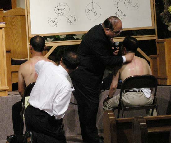 한편 이 목사는 이 날 괄사 치유법을 실제 성도들 2명을 대상으로 해 보이기도 했다.