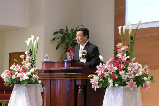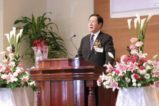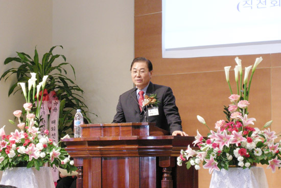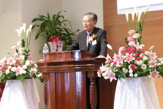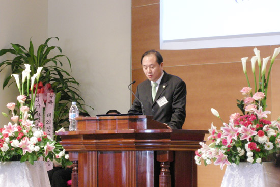 | ▲신임이사장 유일용 안수집사가 취임인사했다. |