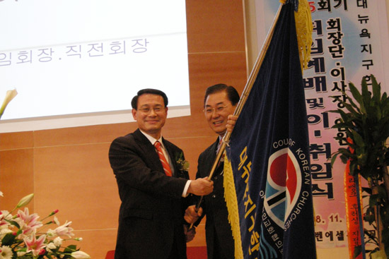 | ▲직전회장이 신임회장에게 교협기를 인계하고 있다. |