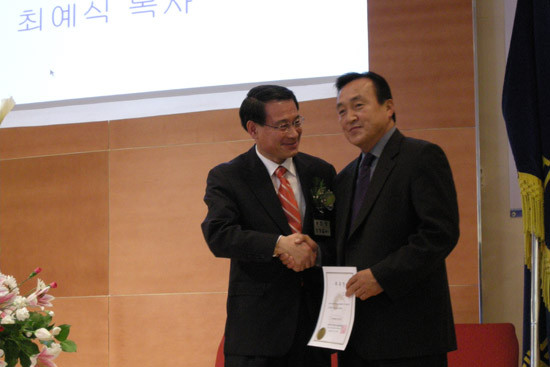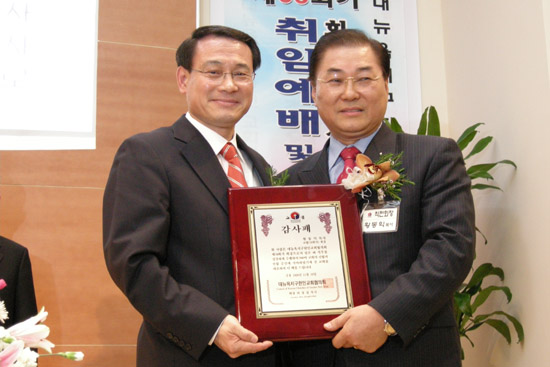 | ▲최창섭 신임회장이 황동익 직전회장에게 감사패를 증정하는 장면 |