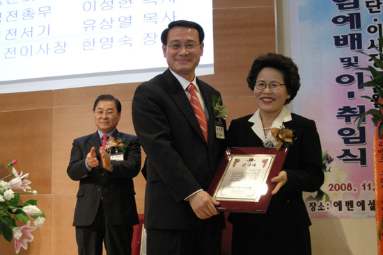 | ▲최창섭 신임회장이 한영숙 전 이사장에게 감사패를 증정하는 장면 |