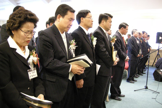 | ▲2부 이.취임식에서 안창의 목사(전임회장)가 시작 기도했다. |