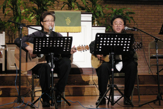 ▲강남규/김신권 집사가 '요한의 아들 시몬아'를 듀엣으로 찬양했다.