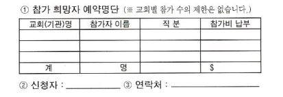 참가 희망자는 12월 31일까지 뉴욕교협 사무실로 접수해야 한다. 접수 방법은 전화나 이메일, 팩스로 가능하다.(참가 희망자는 아래의 신상정보를 전달해야 한다.)