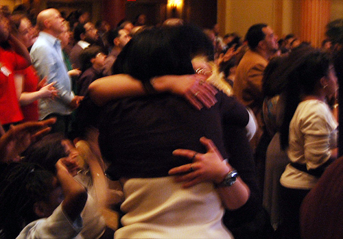 | ▲치유와 회복을 위해 기도하는 찬양 후 서로를 안고 눈물 흘리는 관중 | |