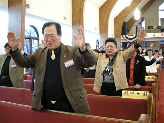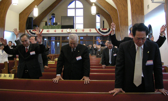 ▲저녁 성회를 위해 임바울 목사(동북노회)가 기도했다.
