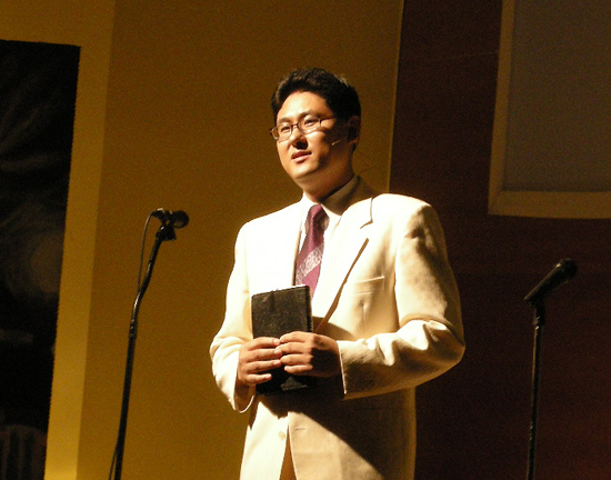 | ▲다민족권 사역을 맡은 이재홍 목사가 복음 메세지를 전하고 있다. | |