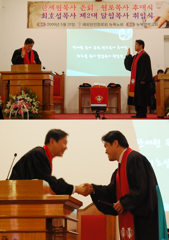 한세원 목사 원로ㆍ공로 목사 추대식과 최호섭 목사 제2대 담임목사 취임식이 5월 28일 오후 6시 뉴욕영락교회에서 열렸다. 행사에는 해외한인장로회 관계자들을 비롯해 전직 교협 회장 등 선후배, 동료 목회자들과 축하객들이 예배당을 가득 메웠다.