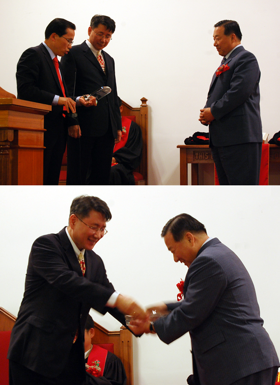 | ▲뉴욕영락교회의 담임 목회자로서 하나님 앞에 충성을 다 할 것을 서약하고 뉴욕노회 신상필 목사로부터 취임패를 받는 최호섭 목사 | |