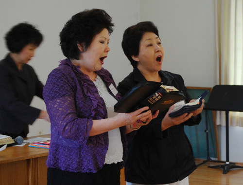 | ▲헌금 특송을 부르는 전명자 목사(좌)와 이미선 목사(우) | |