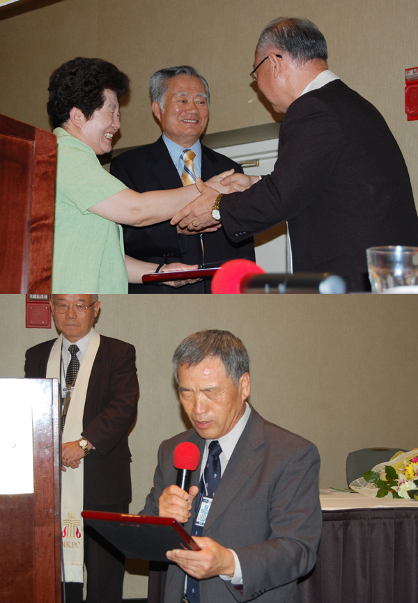 | ▲NKPC로부터 감사패를 받는 안창의 목사와 사모(위)와 감사패 내용을 읽고 있는 이유신 총무(아래) | |