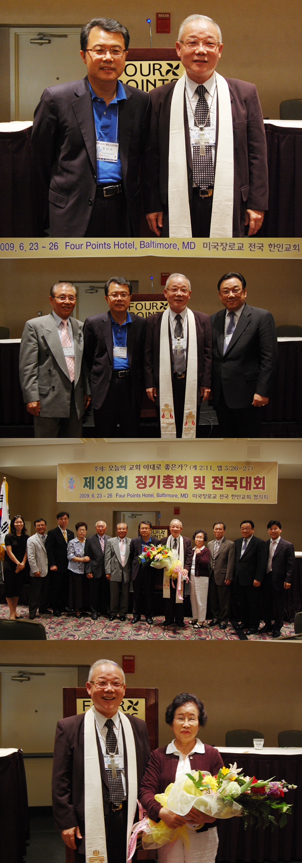 | ▲(맨위)제38대 부총회장 정인수 목사(좌)와 총회장 이승태 목사(우), 교회 관계자들과 함께 기념사진을 찍은 정인수 목사와 이승태 목사, (맨아래)이승태 목사와 사모 | |