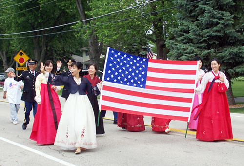 | ▲전통 한복을 입은 한인들이 퍼레이드에서 국기를 들고 행진하고 있다. | |