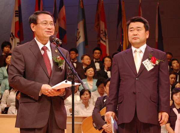 ▲뉴욕교협은 31명의 장학생을 선정해 할렐루야대회 둘째날 장학금을 전달했다. 장학금을 위해 헌금한 교회들에게 감사를 표하는 최창섭 목사(좌)와 김홍석 목사(우)