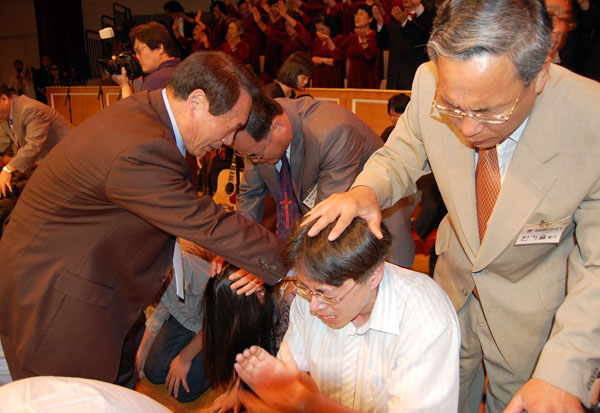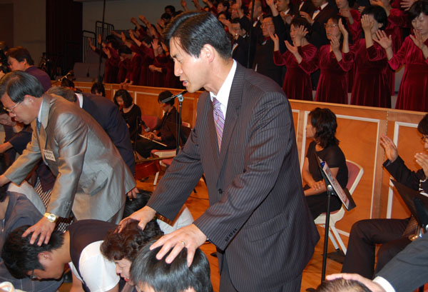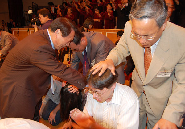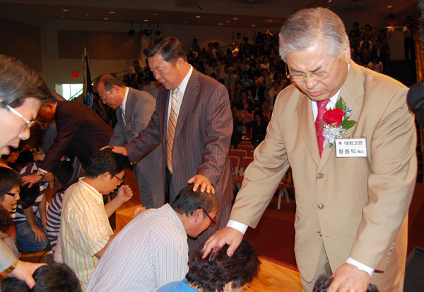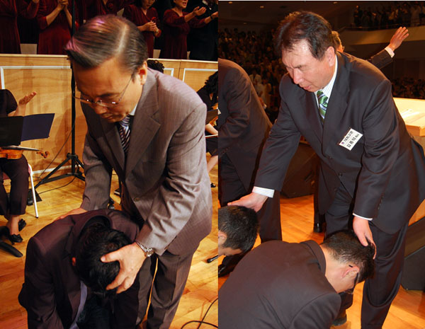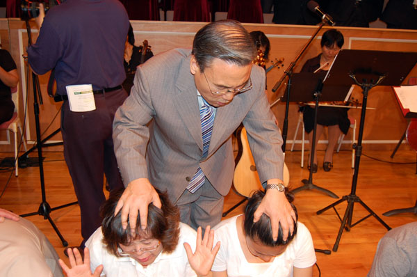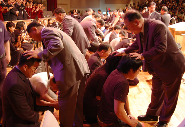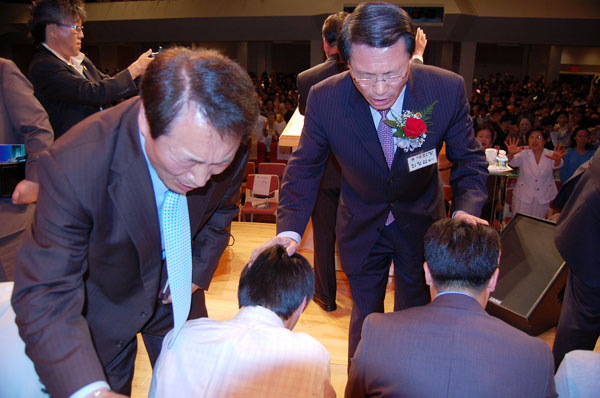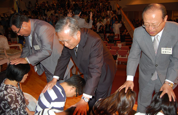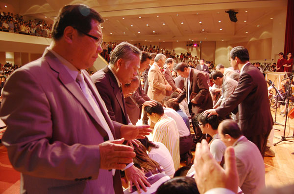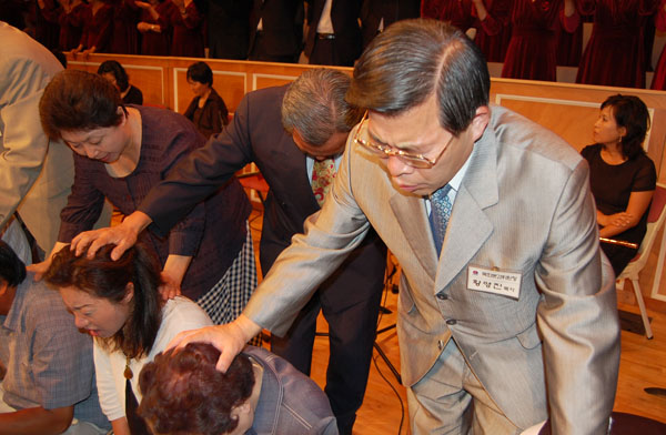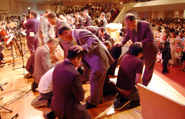 | ▲파송되는 선교사들을 위해 안수기도하는 목회자들 | |