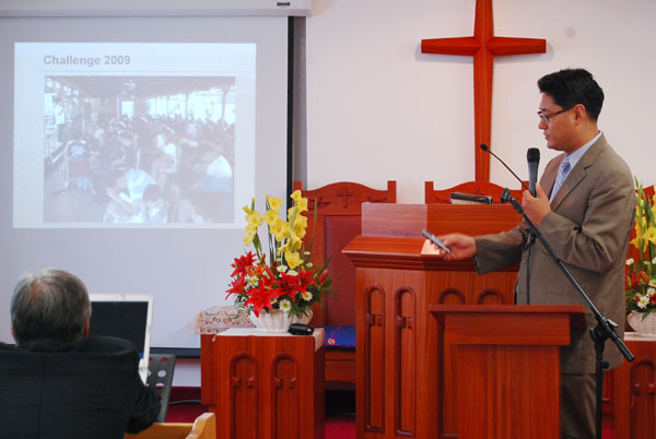 | ▲청소년 수련회에 대해 보고하는 이재홍 목사 | |