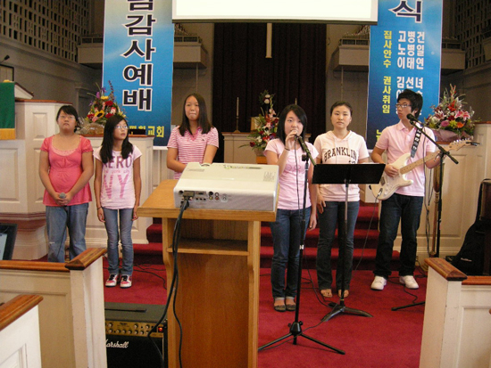 ▲임직을 축하하며 특송한 중.고등부, 청년부