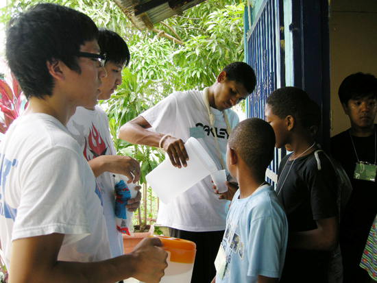 | ▲줄을 선 아이들에게 교사들이 물을 따라 주고 있다. | |