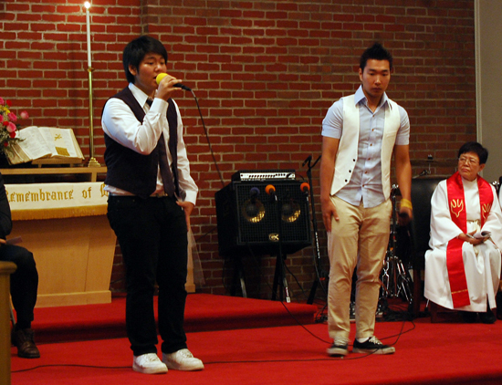 ▲듀엣으로 봉헌송 '폭풍속의 주'를 부른 원재영, 이 앤드류 군