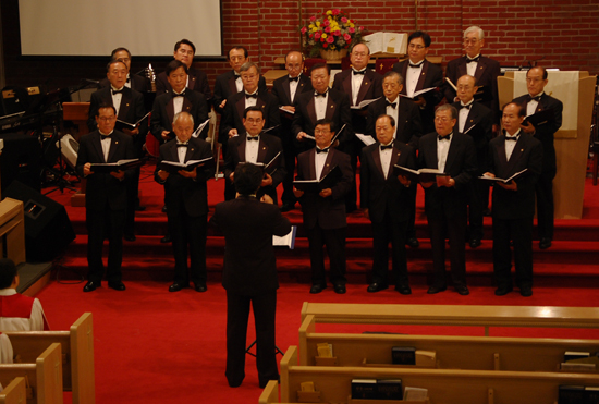 ▲장로성가단의 힘있는 합창 소리가 예배당을 가득 메웠다.