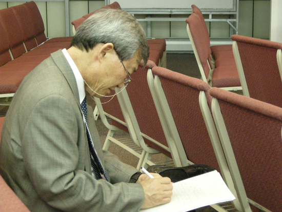 | ▲간증을 적고 있는 김요한 선교사 | |