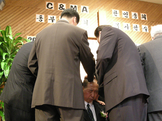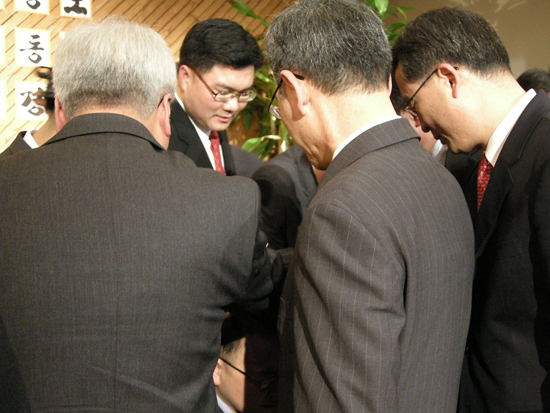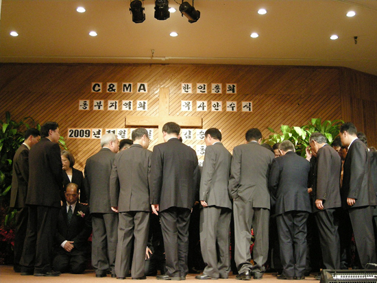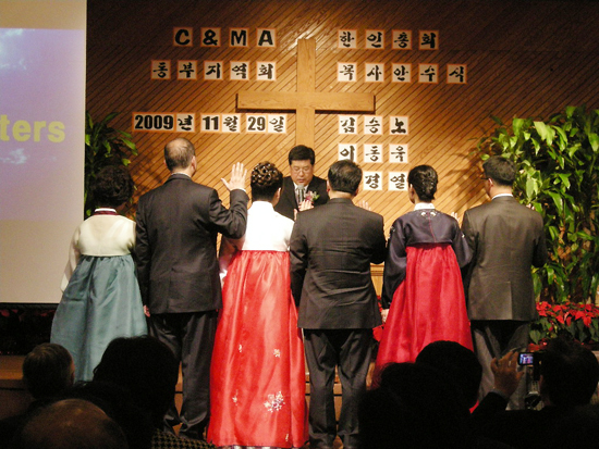 ▲C&MA 교단 목사와 참여한 타교단 목회자들이 안수기도했다.
