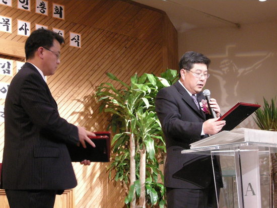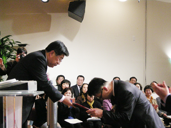 ▲임직패를 전달하는 문형준 감독(한인총회 감독)
