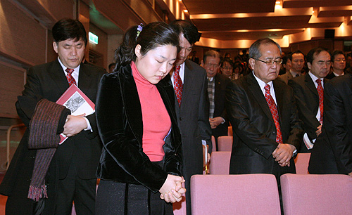 ▲이소연 연구원이 이날 국회의사당 국회의원회관 대회의실에서 강연에 앞서 기도하고 있다. ⓒ 송경호 기자