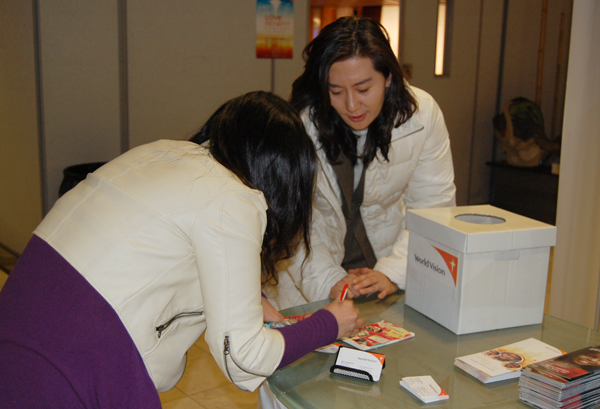 ▲콘서트 후 월드비전 아동 결연 후원 신청서를 작성하는 참가자(좌)와 김윤정 디렉터(우)