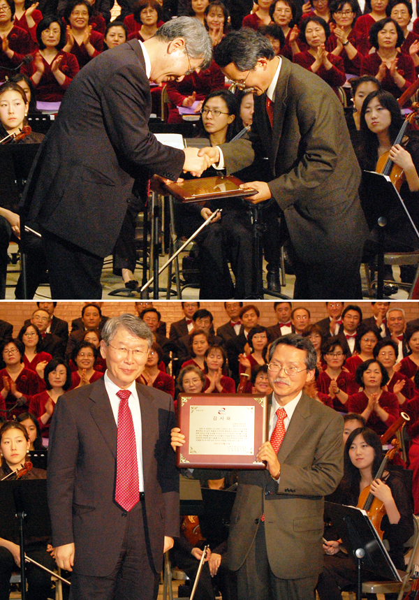 ▲KCTV이사장 김중언 목사(좌)가 후원을 위하 음악회를 열어준 뉴욕효신장로교회 문석호 목사(우)에게 감사패를 전달했다.
