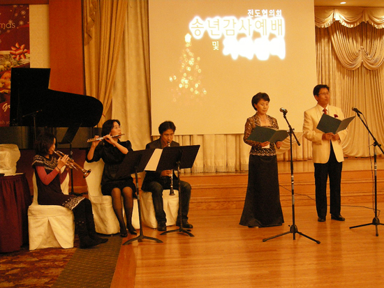 | ▲지인식 목사 내외가 'O holy night'을 듀엣으로 부르고 자녀들이 연주했다. | |