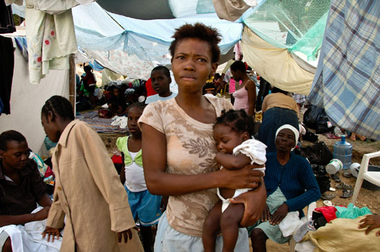 ▲포르토프랭스(Port-au-Prince) 인근의 Canape Vert의 임시 이재민 캠프에서 Gina Gean이 아이를 안고 있다.