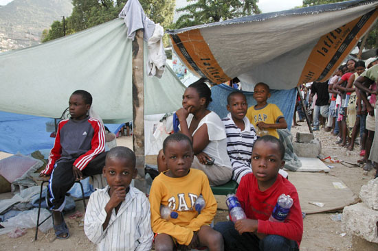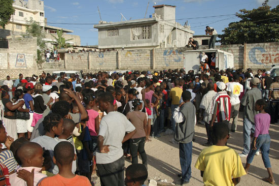 ▲포르토프랭스(Port-au-Prince) 인근의 Canape Vert에서 아이티 아동들이 구호 물품을 기다리고 있다. 옆에는 구호 물품 배분을 기다리는 사람들의 줄이 보이고 있다.