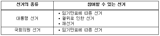 ◉ 대통령선거는 임기만료에 따른 선거뿐 만 아니라 궐위로 인한 선거, 재선거에도 투표권을 행사할 수 있고, 국회의원선거는 임기만료에 따른 선거에 한하여 투표권을 행사할 수 있습니다.