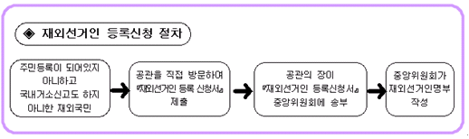 대한국민 내에 주민등록이 되어 있지 아니하고 국내거소신고도 하지 아니한 재외국민으로서 외국에서 투표하려는 선거권자는 대통령선거와 임기만료에 따른 국회의원선거를 실시하는 때마다 반드시 공관을 직접 방문하여 재외선거인 등록신청을 하여야 합니다. 재외선거인 등록신청은 국외부재자신고와 달리 우편으로는 등록신청을 할 수 없으며, 재외선거인 등록신청을 한 선거에 한하여 외국에서 투표할 수 있습니다