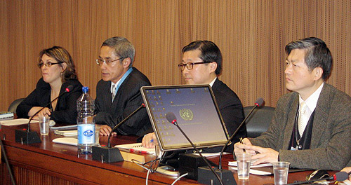 ▲북한에 대한 심의에 앞서 국제인권단체 휴먼라이츠워치와 북한인권시민연합이 공동으로 개최한 합동브리핑 장면. 맨 왼쪽부터 줄리에르 데 리베로 휴먼라이츠워치 제네바 인권옹호국장, 비팃 문타폰 특별보고관, 원재천 북한인권시민연합 국제협력캠페인 이사(한동대 교수), 허만호 대표단장. ⓒ북한인권시민연합 제공