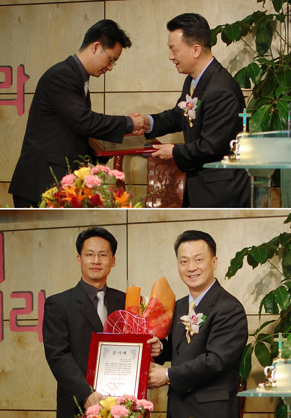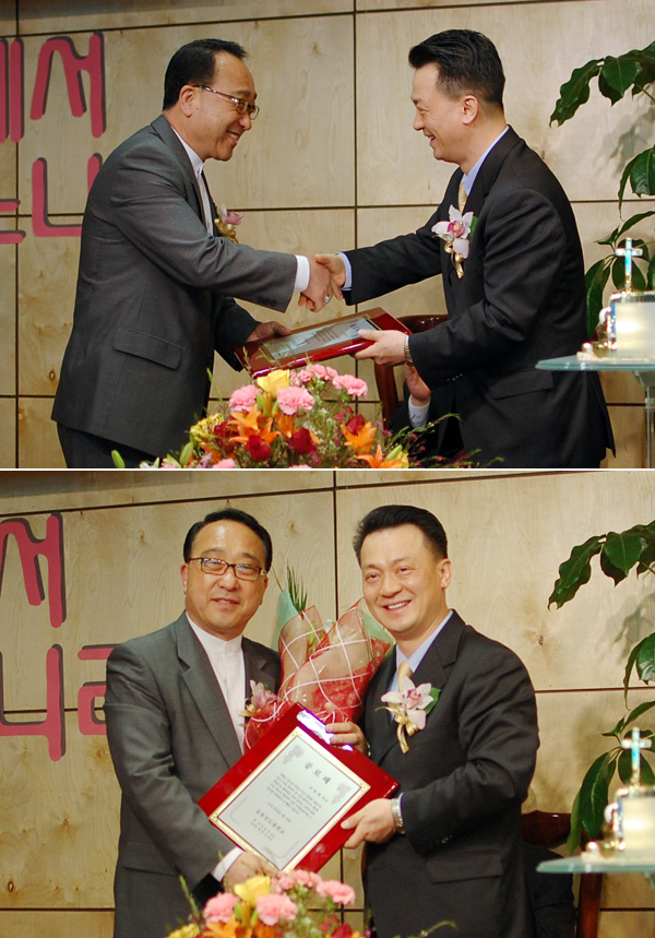 | ▲양승호 목사를 대신해 감사패를 받은 이동희 목사(뉴욕순복음연합교회 부목사) | |