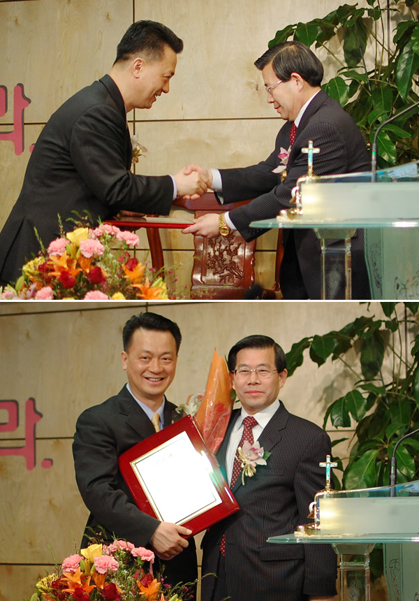 | ▲공로패를 받는 허윤준 목사(직전 이사장) | |