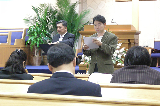 | ▲2부 총회에서 김학룡 목사가 회원 호명했다. |