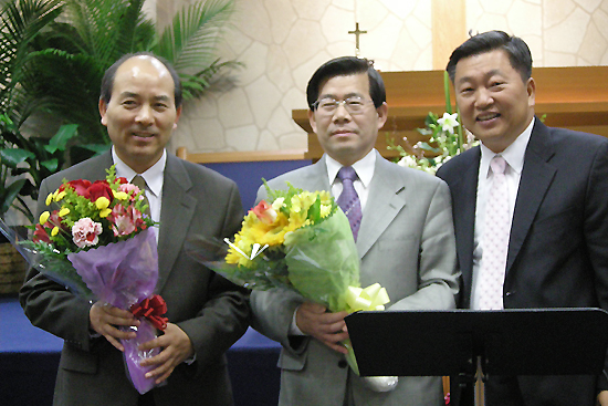 | ▲(오른쪽부터)전임 회장 김기호 목사, 신임 회장 황영진 목사, 신임 부회장 이풍삼 목사. |